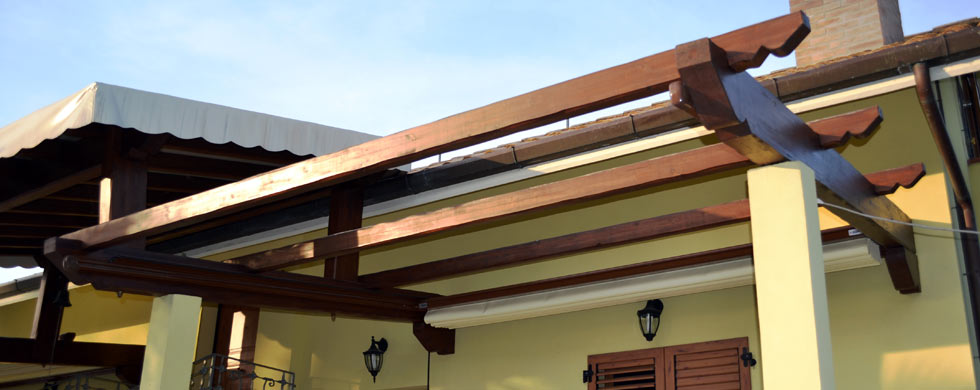Questa particolare pergola in legno lamellare è una struttura creata su misura per proteggere l’ingresso dell’abitazione da sole e dalla pioggia, ma allo stesso temo ci permette di usufruire di spazi utili e piacevoli. Nella parte centrale della pergola abbiamo applicato un tessuto fisso impermeabilizzato, mentre ai lati abbiamo integrato alla struttura la tenda con chiusura a pacchetto “Sole Pioggia”, che grazie al suo tessuto plastificato impermeabile è in grado di grande resistenza alla pioggia e al vento e facilmente chiudibile in pochi istanti.